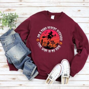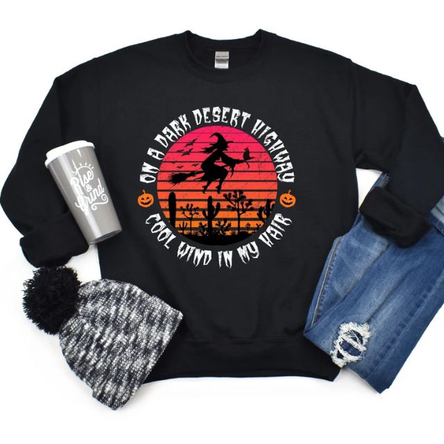 On A Dark Desert Highway Cool Wind In My Hair Sweatshirt has a loose fit for a comfortable feel. Super soft cotton and excellent quality print make one to fall in love with it over and over again. On A Dark Desert Highway Cool Wind In My Hair Sweatshirt, Halloween Sweatshirt, Witch Sweatshirt, Spooky Witch, Halloween Gift, Trick Or Treat.